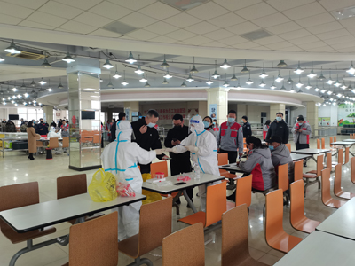 為確保檢測(cè)工作順利進(jìn)行,相關(guān)部門提前制定了周密的檢測(cè)計(jì)劃,在員工食堂內(nèi)部臨時(shí)布置兩個(gè)檢測(cè)點(diǎn)。各單位人員按照進(jìn)度安排,提前在員工食堂外場(chǎng)地保持間距等候,在現(xiàn)場(chǎng)工作人員的調(diào)度下,有序進(jìn)入檢測(cè)區(qū)域。在大家的協(xié)同配合下,當(dāng)天完成 2633人取樣工作,經(jīng)檢測(cè)結(jié)果均為陰性。