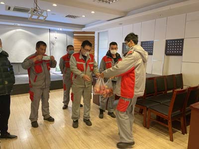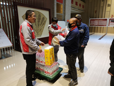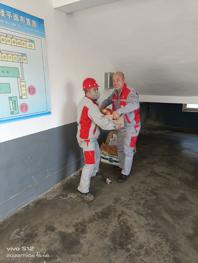 公司時刻把員工身心健康放在首位,同時也關(guān)心著留宿的施工人員,為他們送去生活用品和水果;關(guān)懷因疫情防控不能下車、吃不上飯的貨車司機,沖泡好方便面,遞上香腸、咸菜、鹵蛋等,讓他們也感受到家的溫暖。